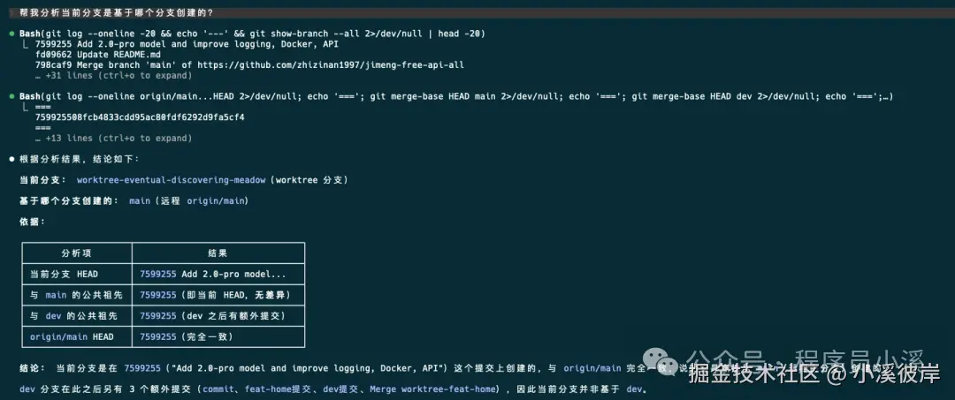 我们也可以让AI帮我们分析,可以看到AI通过 git log、git merge-base 等信息确认:worktree是基于 origin/main 创建的,而非当前分支