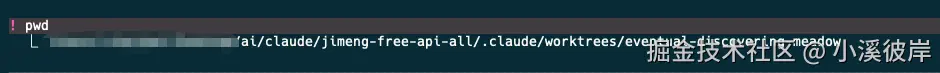 在启动的Claude Code CLI中执行 !pwd 可以看到当前工作区目录已经变成了Worktree工作区目录,已经不再是默认的主工区目录了