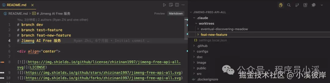合并完成后,我们就得到最终合并后的代码,合并后可以看到Cluade Code同时清理了test-feature Worktree工作目录和分支
