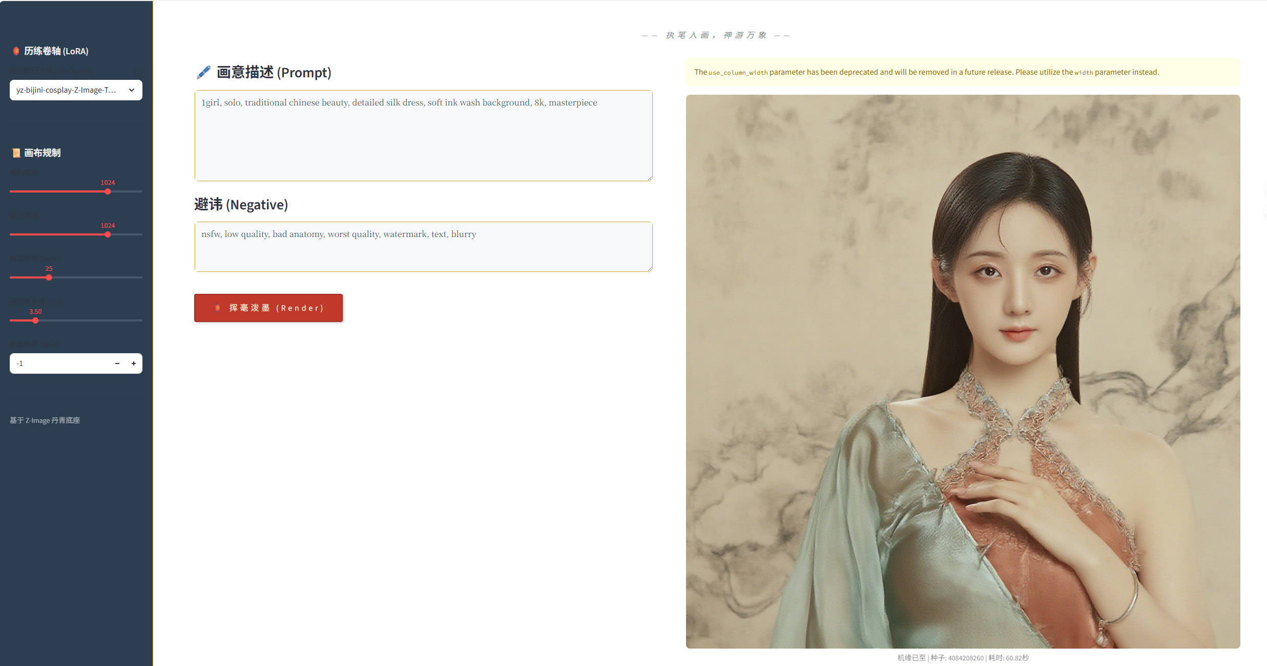 丹青幻境 是一款基于 Z-Image 架构与 Cosplay LoRA 历练卷轴打造的数字艺术终端。它告别了冷硬的科技感,将 4090 的磅礴算力隐于宣纸墨色之中,旨在为画师提供一个静谧、沉浸的"灵感实验室"。