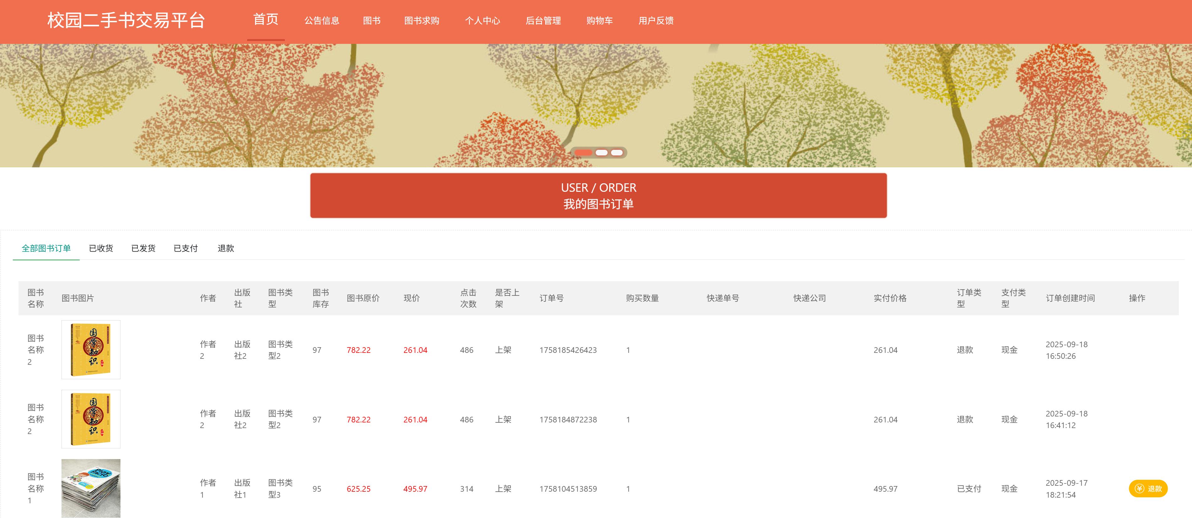 预览此项目,需要加入区块链的元素的部分很明显在图书订单模块,订单的状态分为已支付、已发货、已收货和退款四种状态,所以看可以理解为一个溯源系统,用来记录图书订单商品,一共需要修改的部分有如下几个地方: