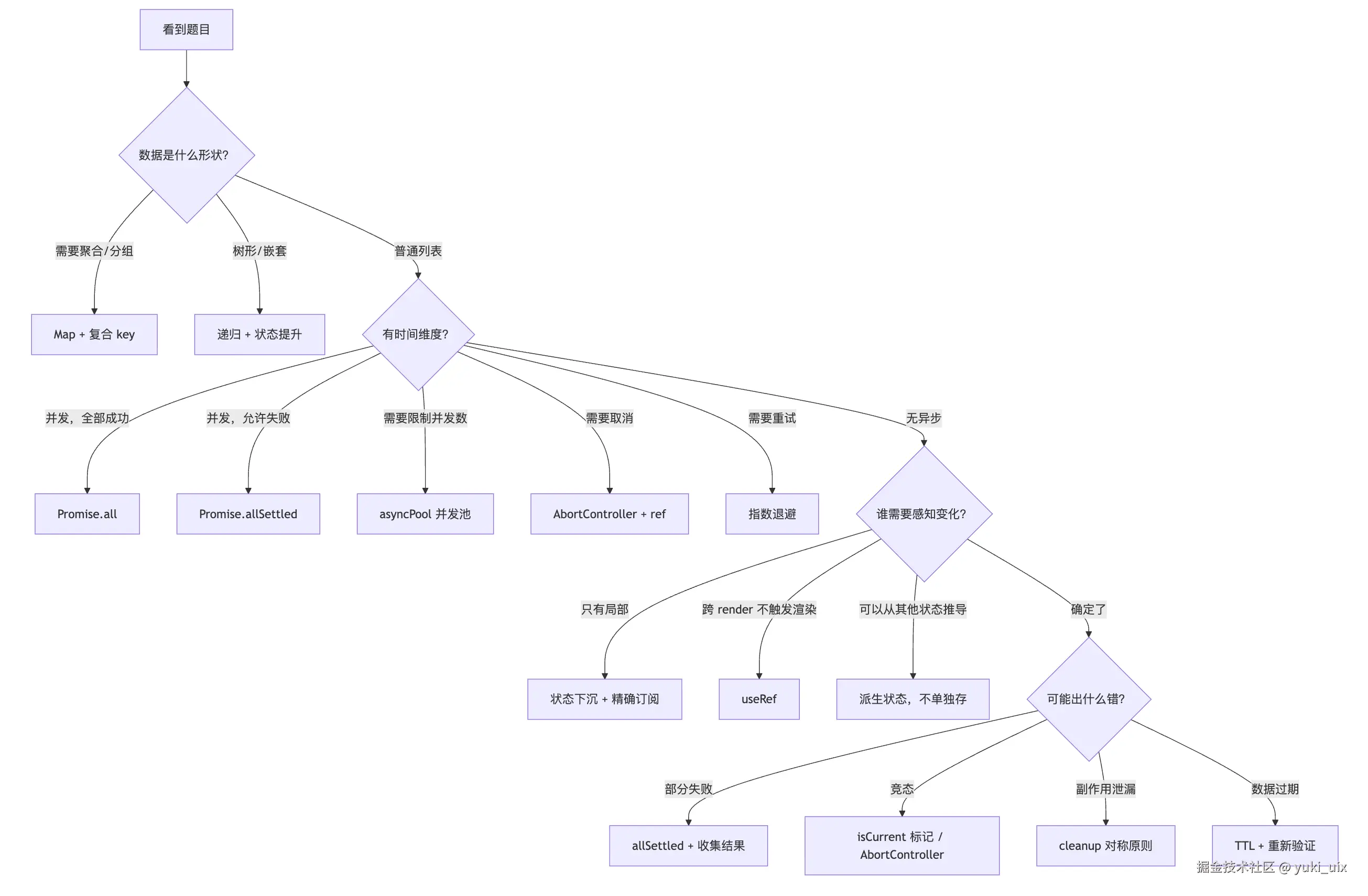 同样是"批量操作",有人问的是"批量审批,允许部分失败",有人问的是"批量上传,限制同时最多 3 个"。表面上都是批量,但前者的核心是容错并发 (Promise.allSettled),后者的核心是背压控制(并发池)。如果只靠关键词匹配,看到"批量"就想到同一个答案,就会答错。