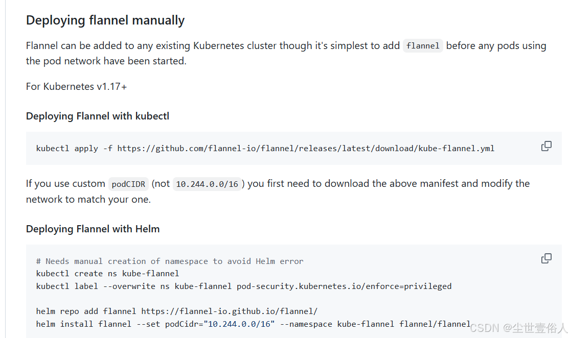 官方仓库中已经告诉你,如果你是1.17+的版本,你可以直接运行命令下载相应的镜像并安装,刚好本篇中的版本够线。但是!你要注意它下面的小字,如果初始化集群时用的Pod网络策略不是 10.244.0.0/16就要自己设置