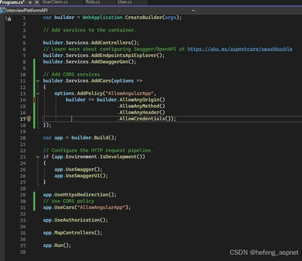 在启动时配置 CORS:在 .NET Core 8 中,CORS 的配置通常在 Program.cs 文件中完成。以下是一个简单的配置示例。