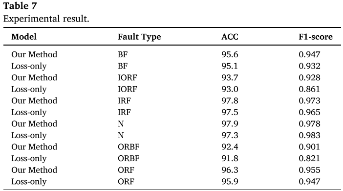 - 本文方法在6类故障上平均 ACC 达 95.8% ,F1-score 为 0.942。