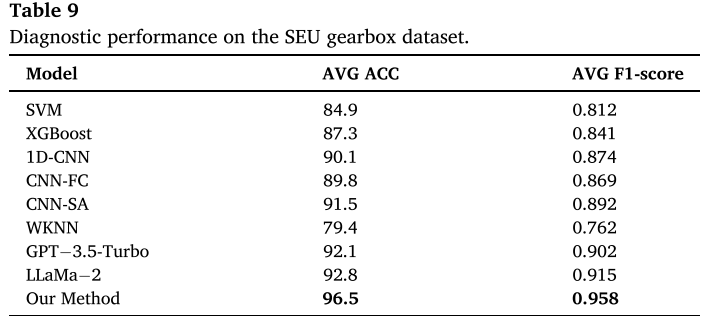 【Table 9 SEU 齿轮箱数据集诊断性能】