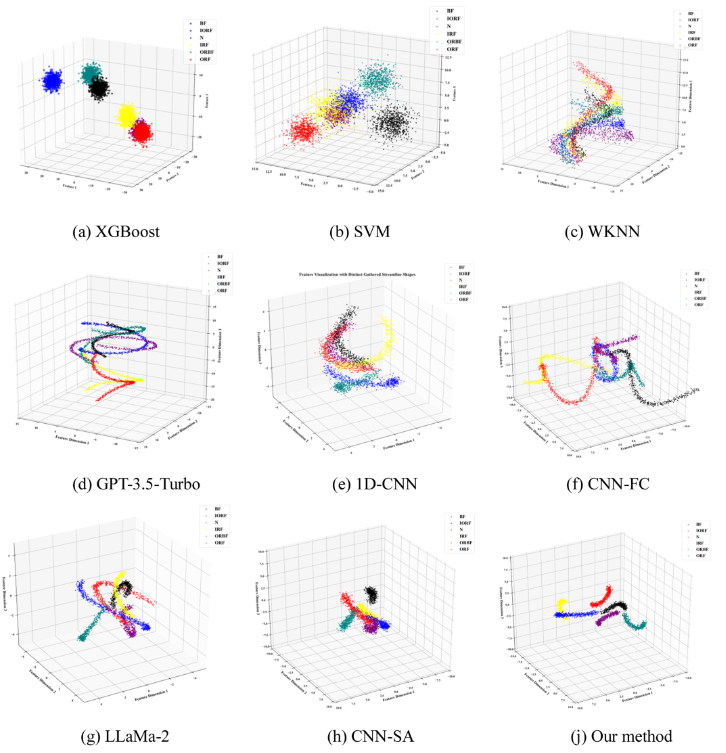 共选取8种基线模型,覆盖传统机器学习(SVM、XGBoost)、经典深度学习(1D-CNN、CNN-FC、CNN-SA、WKNN)和大模型(GPT-3.5-Turbo、LLaMa-2)三大类别,评估指标为准确率(ACC)和 F1-score。