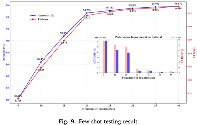 仅使用 5% 的训练数据 时,框架仍能达到 80.2% 的平均准确率。从 5% 增至 20% 时,准确率提升高达 14.5%,这是因为知识图谱的无监督关系挖掘大幅降低了对有标注数据的依赖,动态更新机制能够将新增样本的时频模式系统地融入图结构。