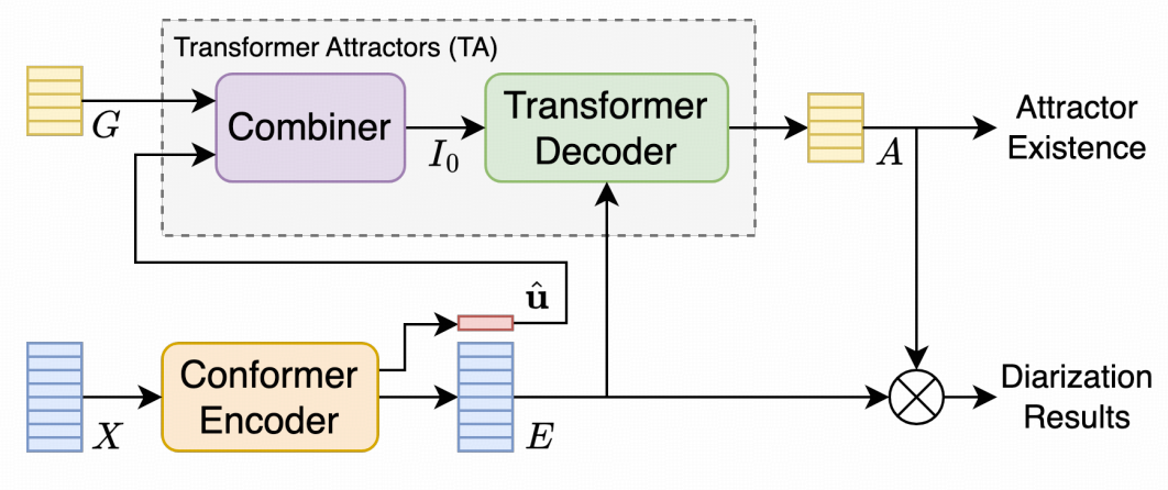 这篇 EEND-TA 把 EEND-EDA 里基于 LSTM 的 attractor 生成模块,换成基于 Transformer 的 attractor 生成模块。