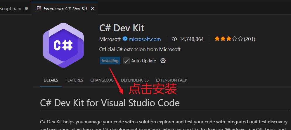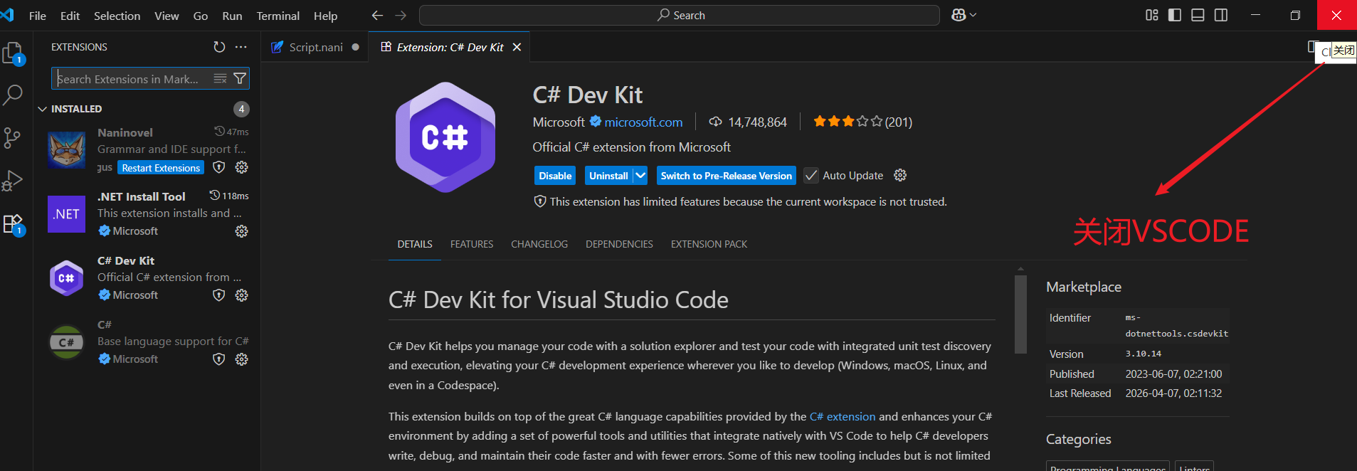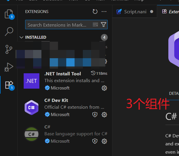 首先进入VSCODE,点击配件下载界面,搜索C#,点击下载C# Dev Kit