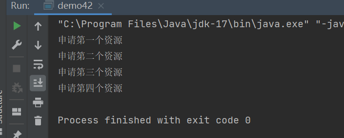 System.out.println("申请第四个资源");