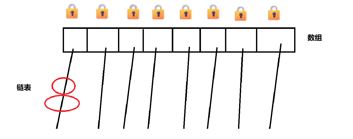 此时任意两个线程访问任意的两个不同元素,都会产生"锁竞争"