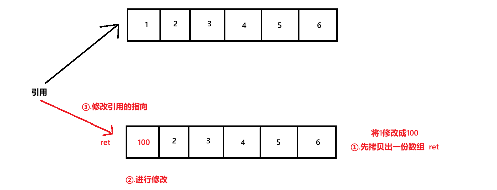 例如,如果第一个线程修改前三个数据,第二个线程修改后三个数据,那么此时就会出错,可能最后引用指向了第二个线程修改后的数组,那么就不一定确保前三个数据被完整的修改