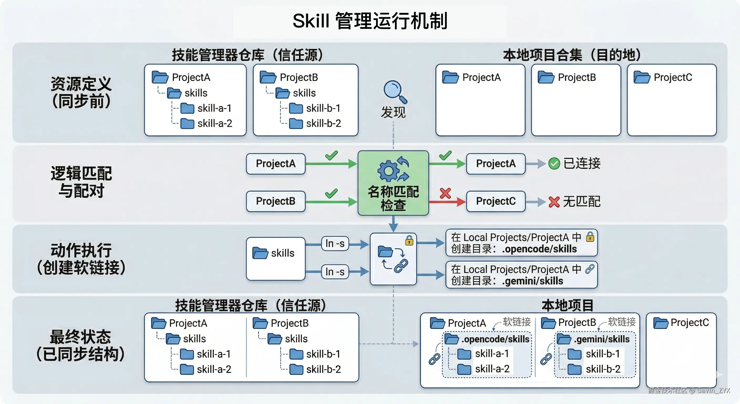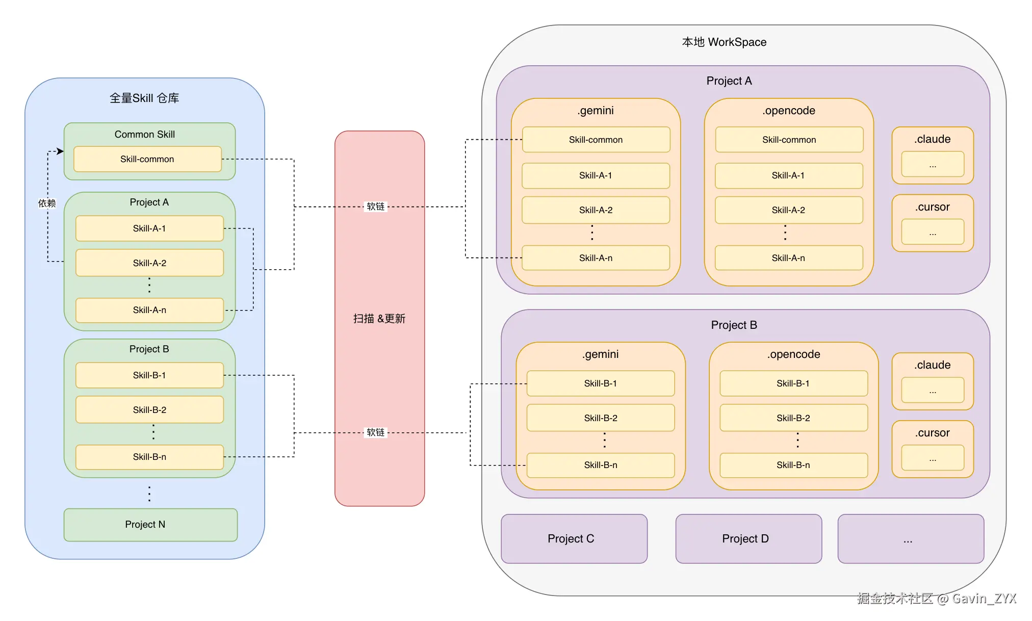 为多项目并行开发打造的 AI Skill 管理工具,它允许你在一个中心仓库维护所有 Skill,并通过极轻量的软链机制分发到各个独立项目中。