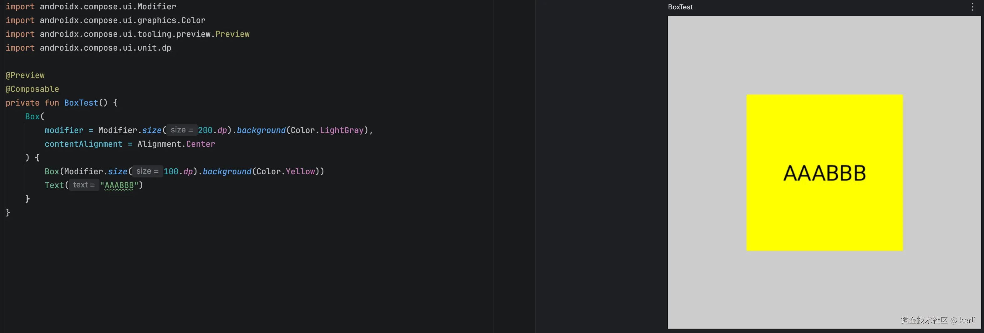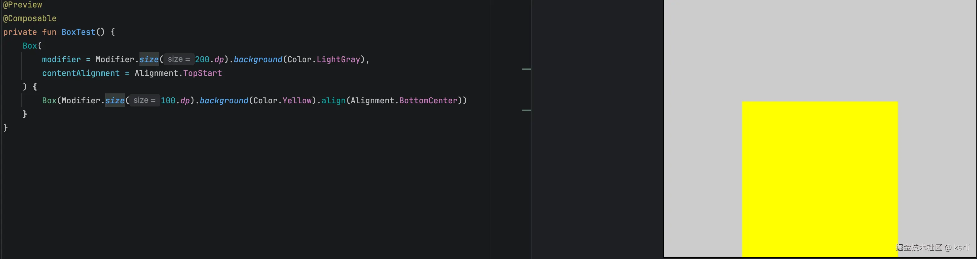 不同于 Row 和 LazyColumn,contentAlignment 的设置是「二维」的,因为 Box 的水平和垂直方向都是自由的,必须同时指定两个方向。
