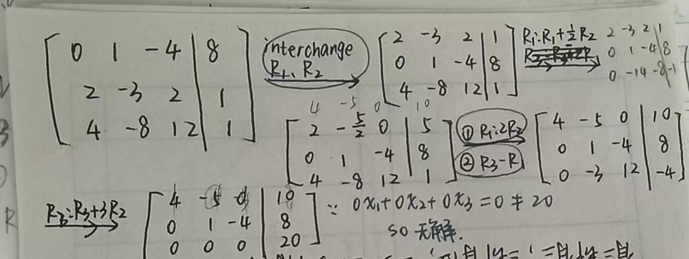 1.直接交换 interchange two rows 2.倍数变换再替换 multiply all entries in a row by a nonzero constant 3.用自身和其他行的倍数交换 replace one row by the sum of itself and a multiple of another row