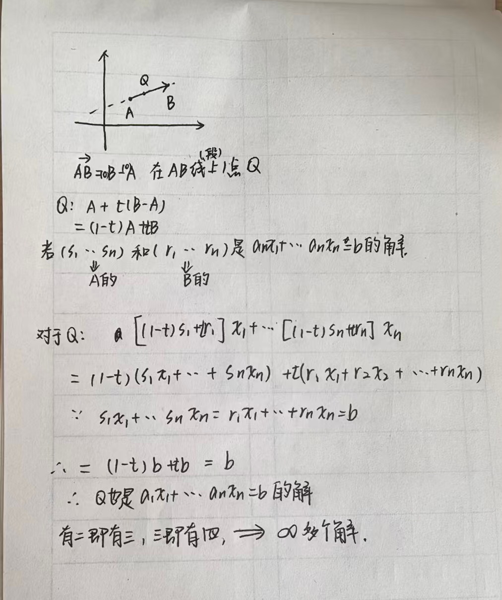 对于无穷解的证明:假设AB是线性方程的解 那么有