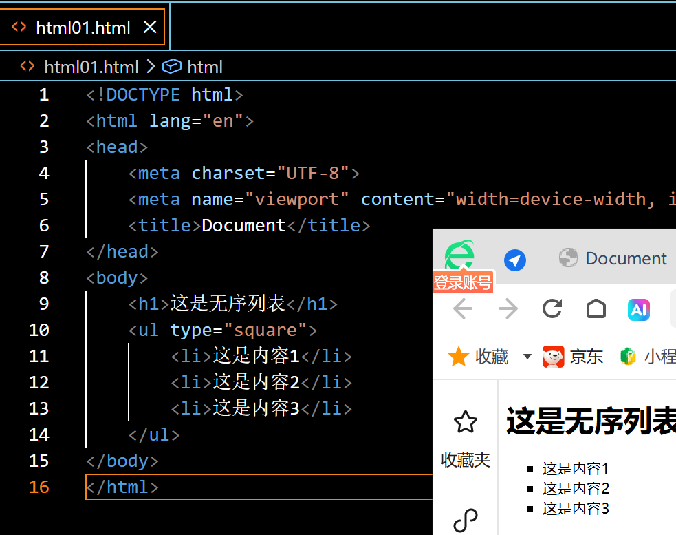 如果要把前面的实心圆改成其他样式,则需要增加属性,浏览器默认展示方式为为"disc"(实心圆)。下面的属性示例为"square"(黑色小方块),也可以有"circle"(空心圆圈)。