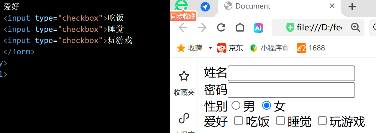 ④复选框:<input type="checkbox"> 吃饭 <input type="checkbox> 睡觉 <input type="checkbox">
