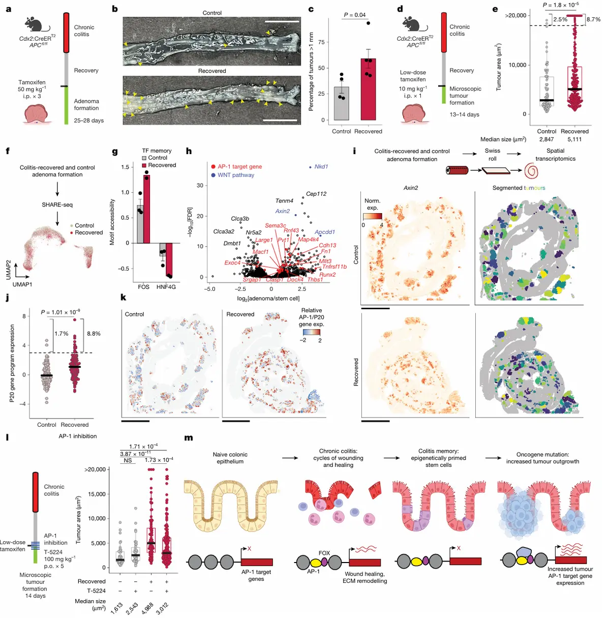 机制模型:慢性炎症在结肠干细胞中编码了一种以"修复"为特征的表观遗传记忆(AP-1及组织特异性TF结合位点的可及性累积增加)。当这些携带记忆的干细胞获得致癌突变后,记忆会通过持续激活促增殖基因程序,加速恶性进展,从而解释了慢性炎症为何会增加癌症风险。