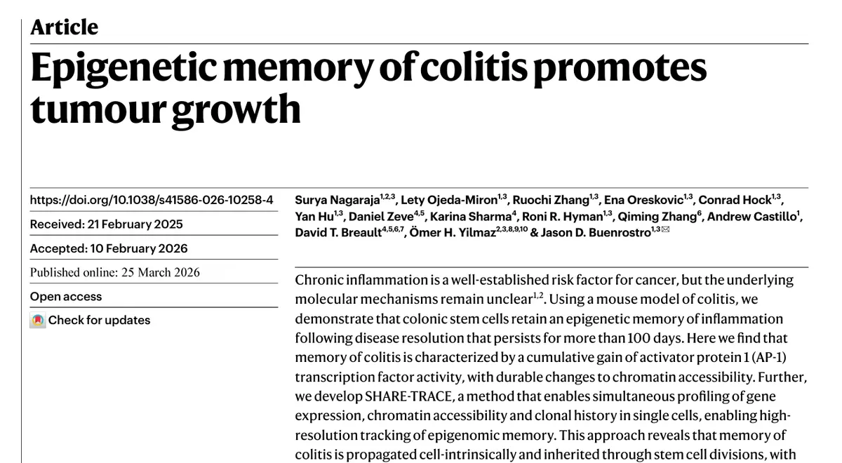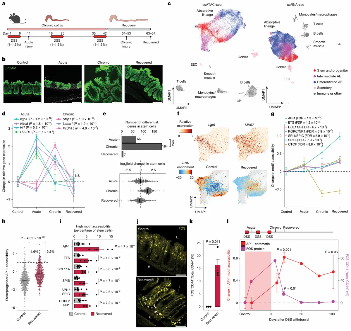 炎症记忆的存在:在小鼠慢性结肠炎模型中,即使组织在形态和功能上已恢复(超过100天),结肠干细胞的表观基因组仍与健康对照显著不同。这种记忆在分化细胞中减弱或消失。