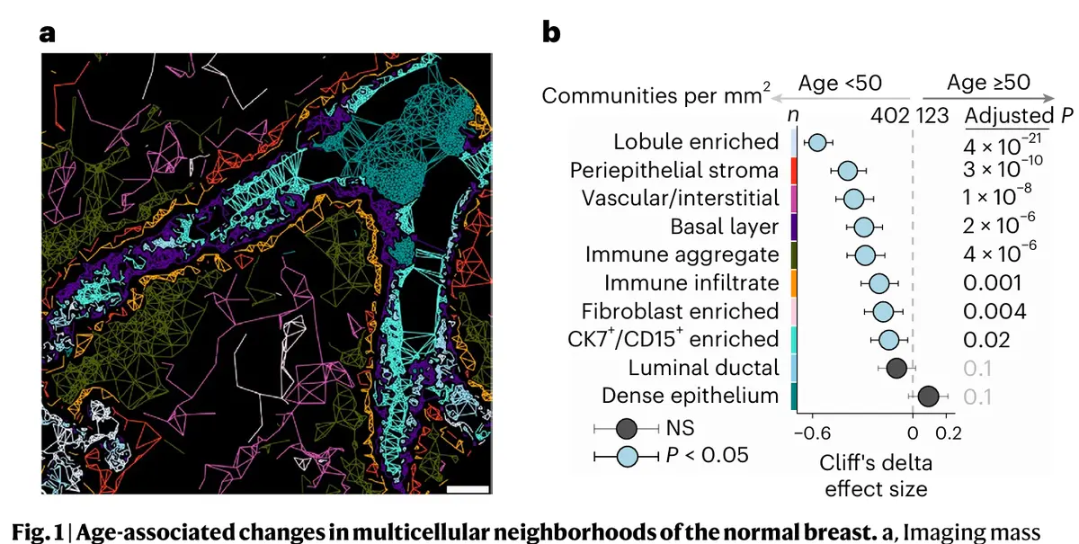 与许多其他组织一样,乳腺组织会随年龄增长不断积累体细胞突变。这些基因变化解释了为何乳腺癌的发病率在晚年升高。值得注意的是,年轻患者(40岁以下)中发生的肿瘤与晚年发生的肿瘤有所不同,但局部组织微环境在肿瘤早期发展中的作用仍不清楚。例如,肿瘤发生的空间背景可能在限制、塑造或促进肿瘤形成方面发挥重要作用。然而,无论是这种局部空间背景的特征,还是其随年龄变化的演变方式,目前都尚未被充分理解。对衰老乳腺组织更清晰的认识,可能会为肿瘤的早期发展提供线索,并提示预防或降低风险的方法。