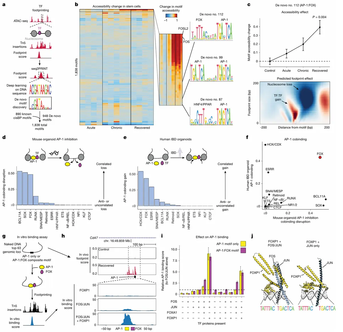 发现关键复合motif:利用seq2PRINT技术,在结肠炎进展过程中鉴定出一个AP-1/FOX复合基序,其可及性随炎症记忆而增加,并能通过置换核小体来增强DNA可及性。