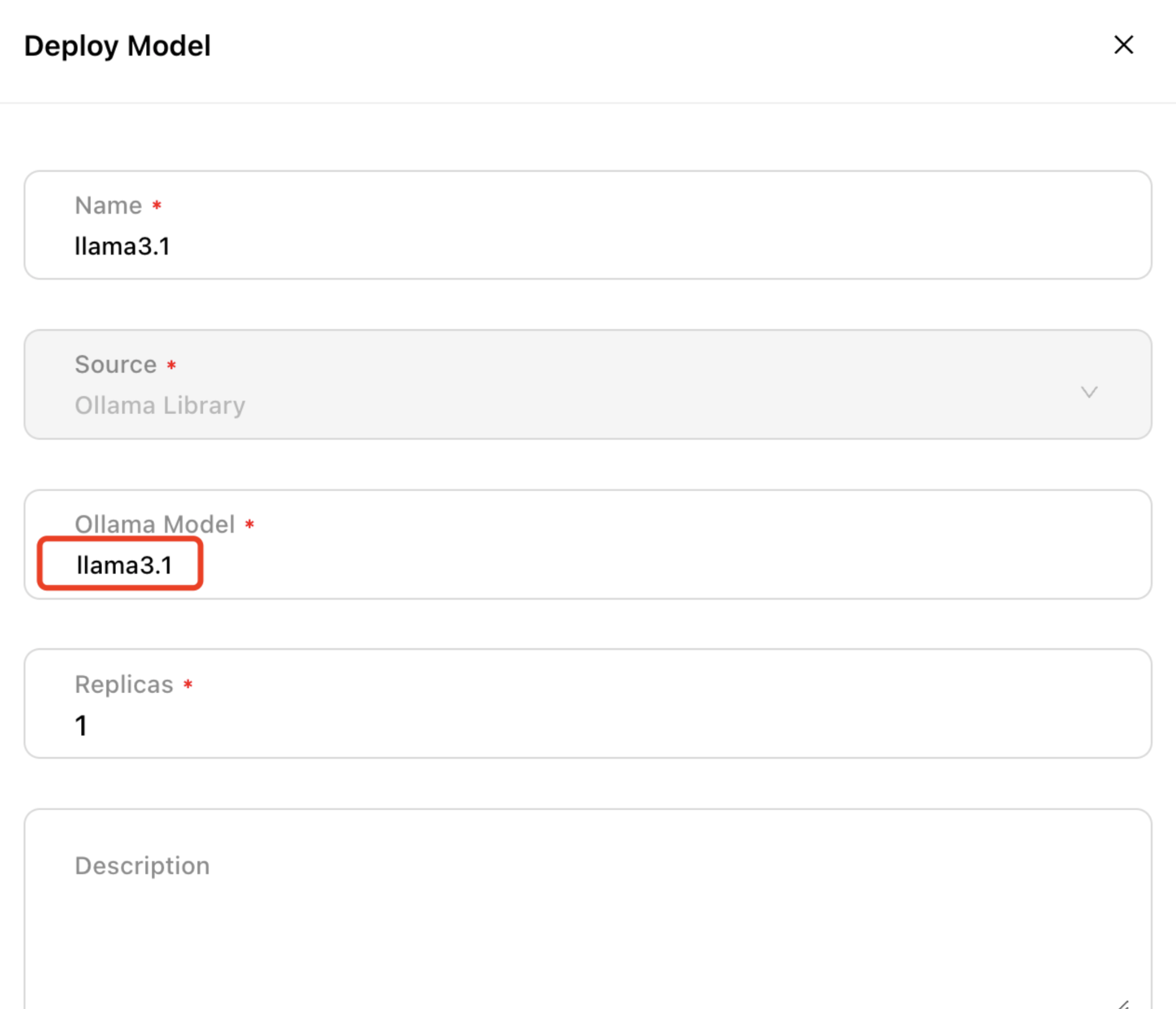 访问 GPUStack ,选择模型-部署模型 ,选择从 Ollama Library 部署,填写前面推送到 Docker Registry 的模型名称,教程示例是 llama3.1,如下: