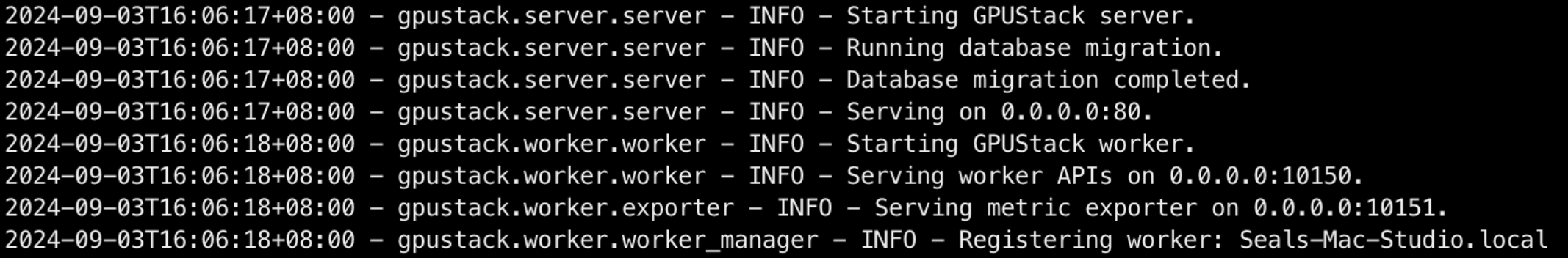 检查 GPUStack 日志,确认 GPUStack 服务正常启动:tail -200f /var/log/gpustack.log