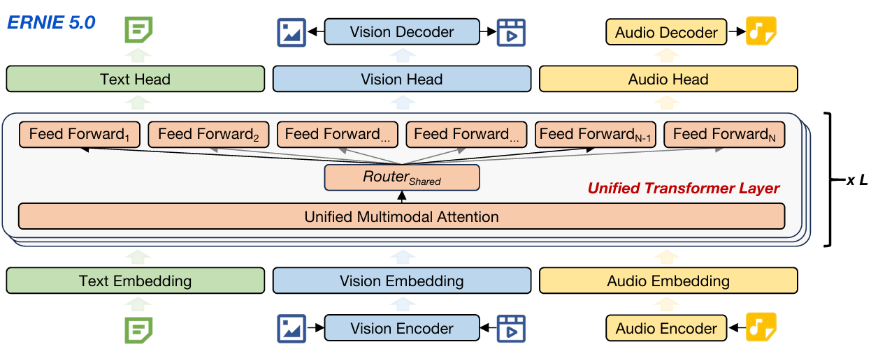 ERNIE 5.0 采用超稀疏混合专家(MoE)架构 ,在单一自回归框架内融合文本、图像、视频、音频四大模态的理解与生成。