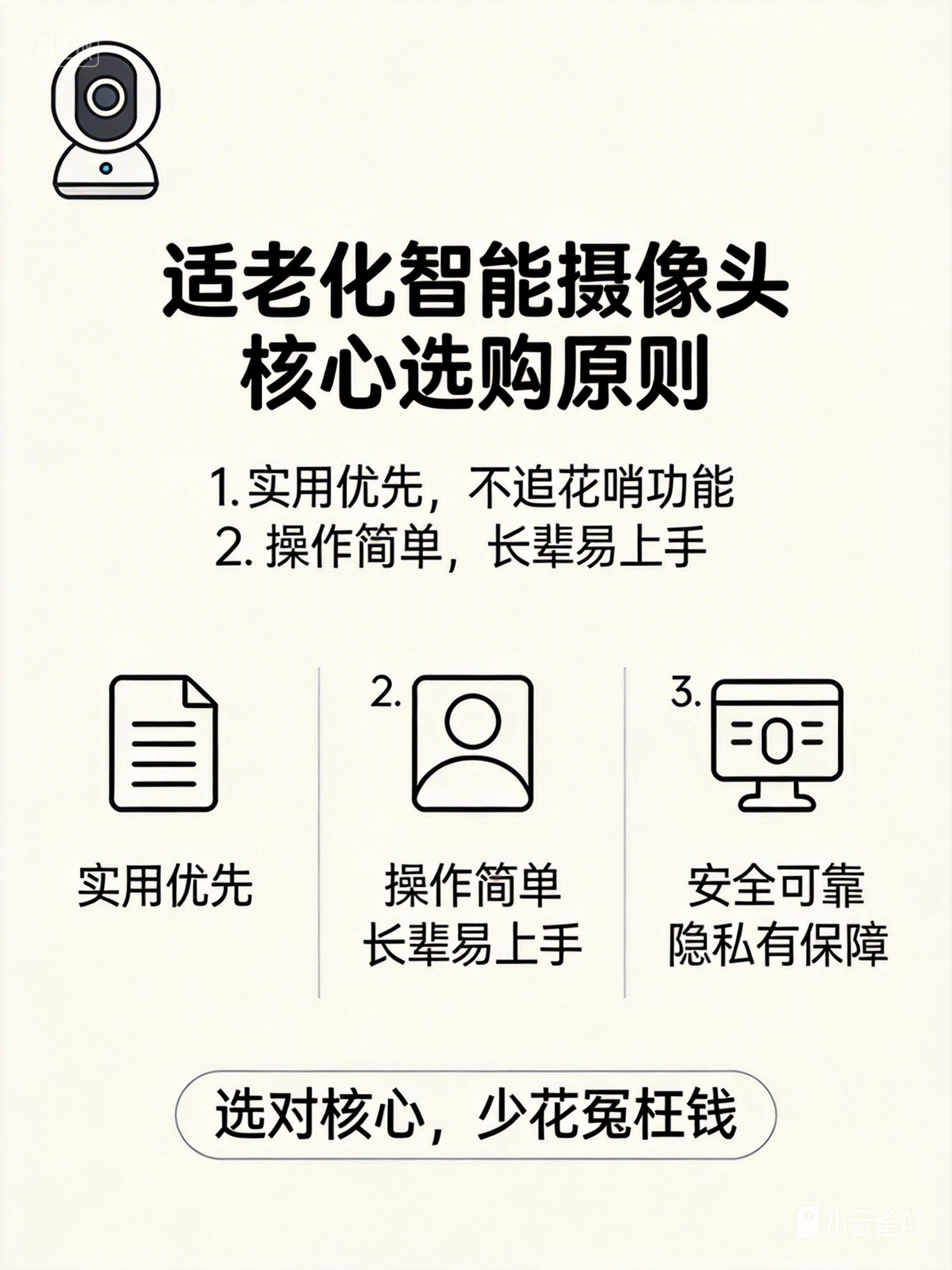 在为适老化改造选择智能摄像头时,安全性、隐私保护、易用性、功能实用性和可靠性是核心考量因素。以下是我为您精选的推荐方向和具体建议:
