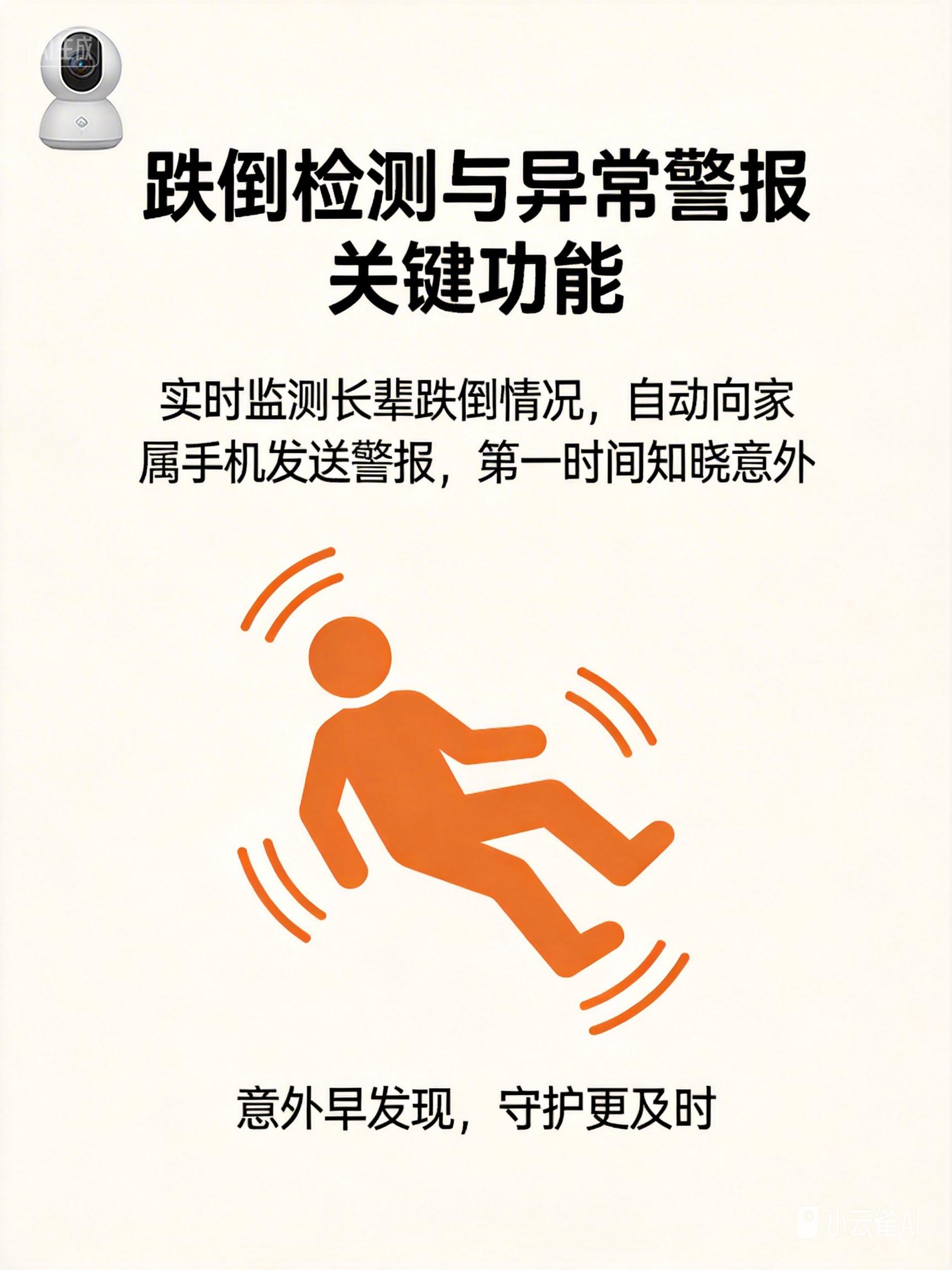 - 核心功能: 选择具备专业级AI跌倒识别算法的摄像头(如海康威视、大华旗下品牌),误报率低才实用。移动侦测灵敏度要可调,避免风吹窗帘就报警。