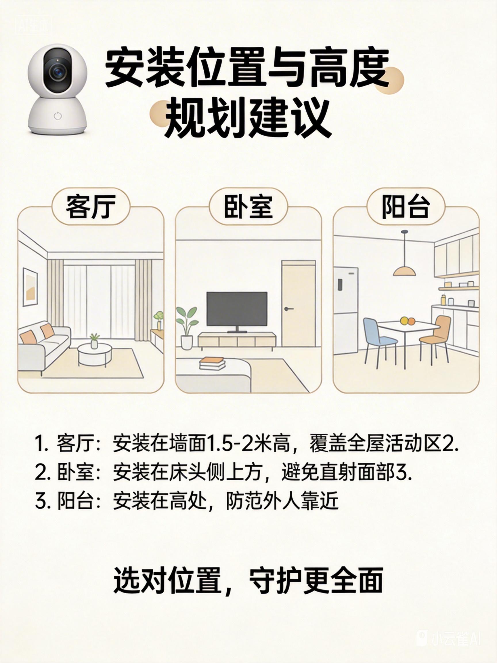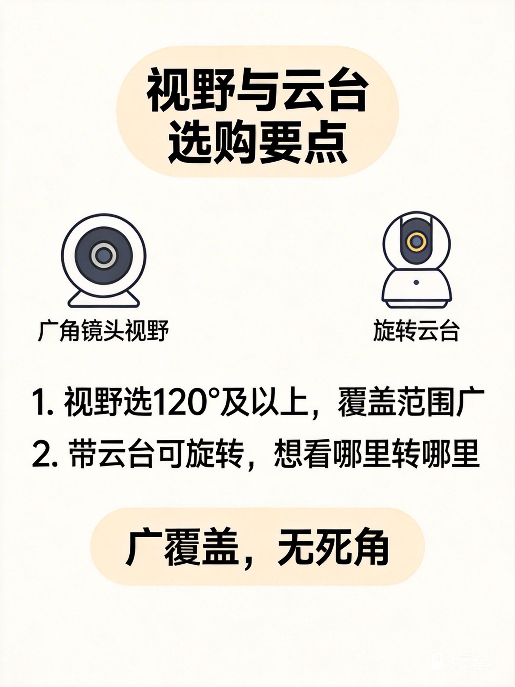 - 替代方案: 若预算有限,选择140°以上水平广角的固定镜头,减少死角。
