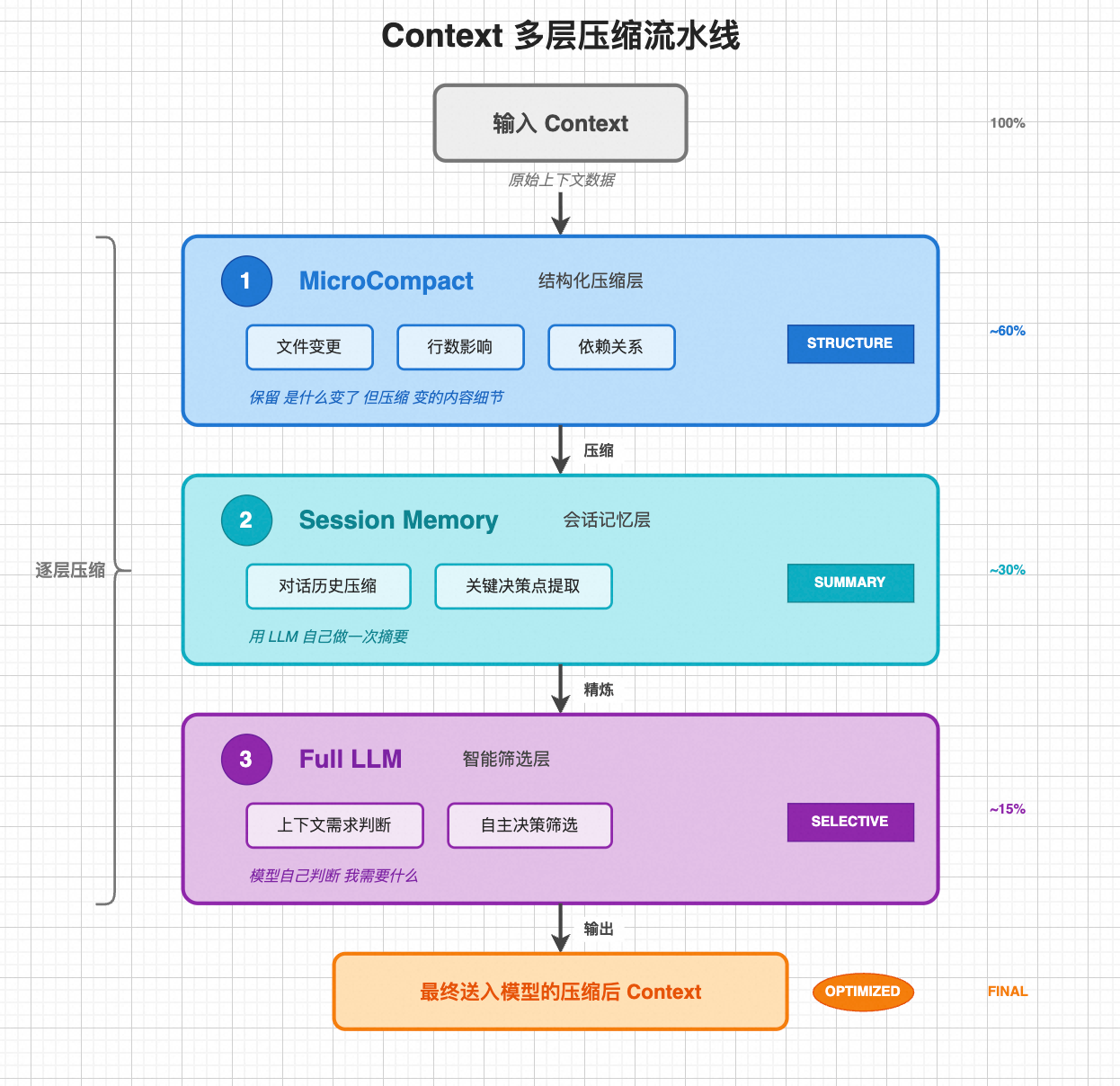 因为单层压缩要么失真太多(直接截断),要么太贵(全部塞进去)。Claude Code 用了一个很聪明的思路:用小模型做粗筛,用大模型做精筛。MicroCompact 先把明显无关的去掉,Session Memory 做会话级别的聚合,最后 Full LLM 判断"这个决策需要哪些上下文"。