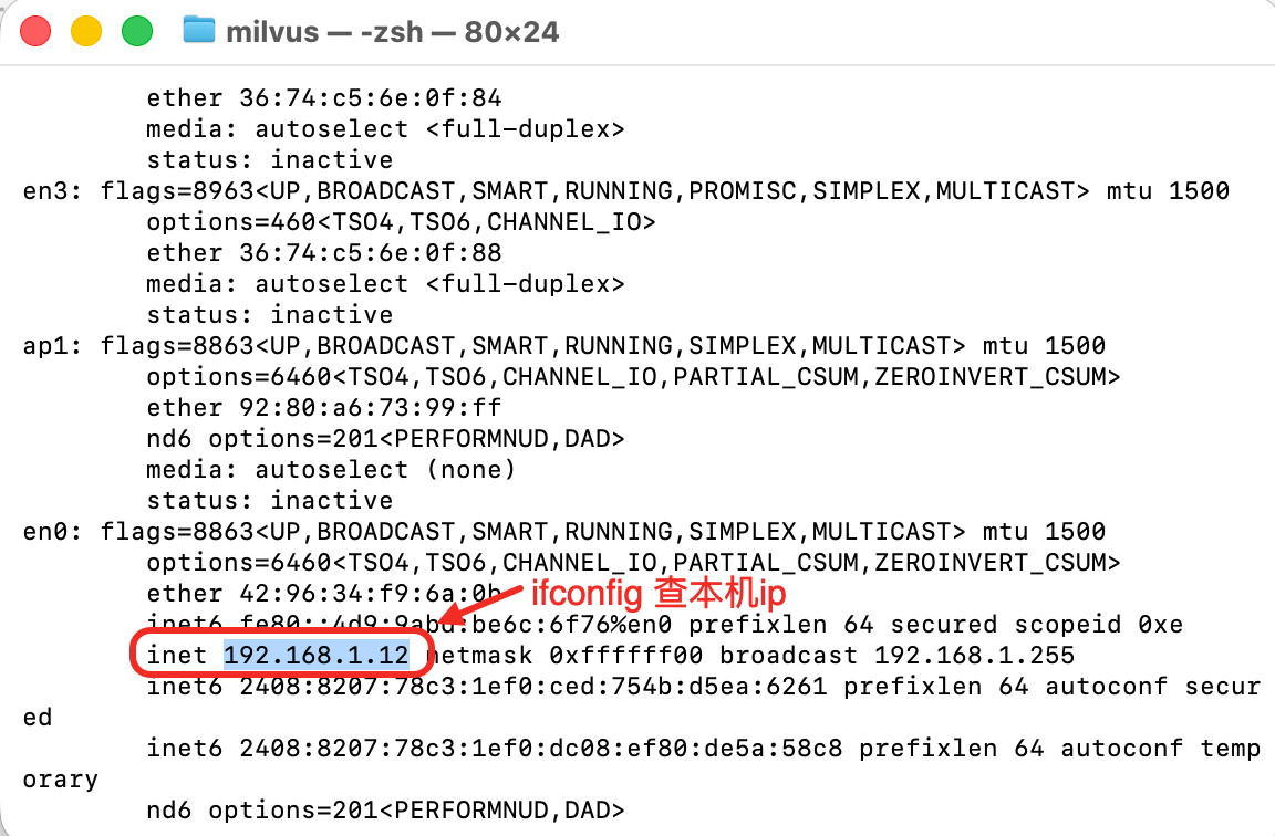 ifconfig或ip addr,找到类似192.168.x.x的 IP。 -