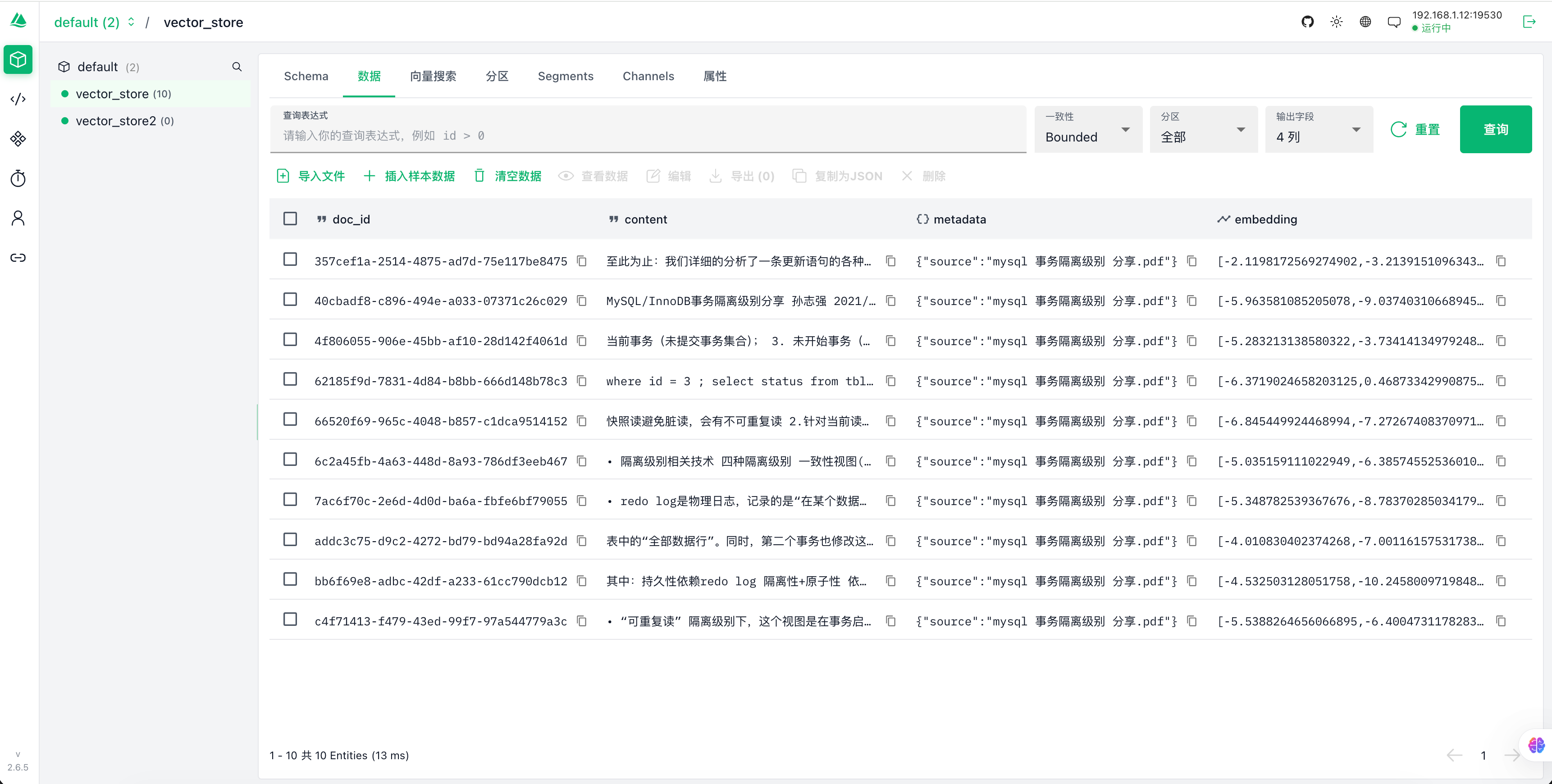 连接成功后的界面如下,选择对应的Collection就可以查看向量库中存储的数据了: