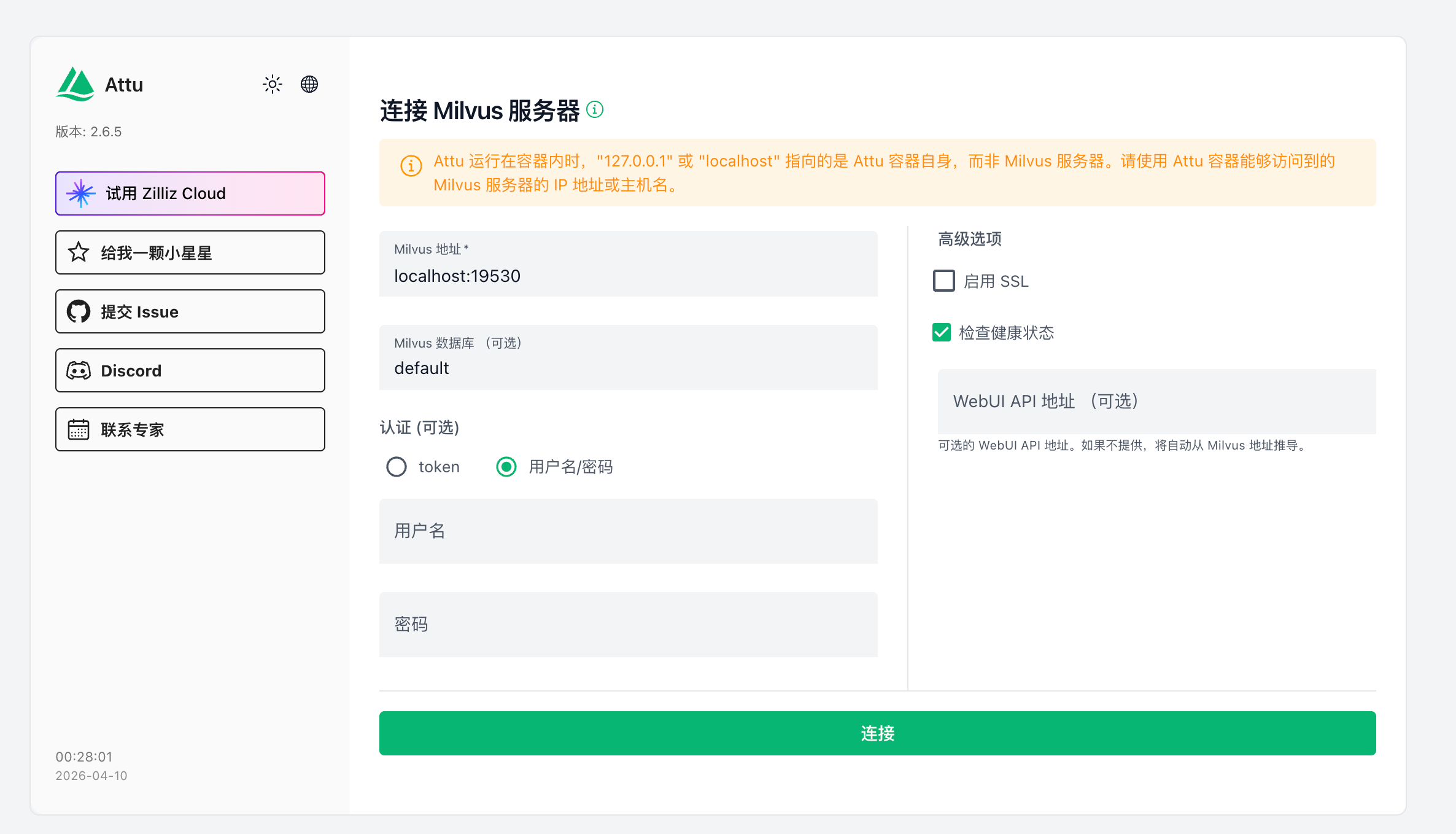 localhost指向的是 Attu 容器自己,而不是 Milvus 容器。 -