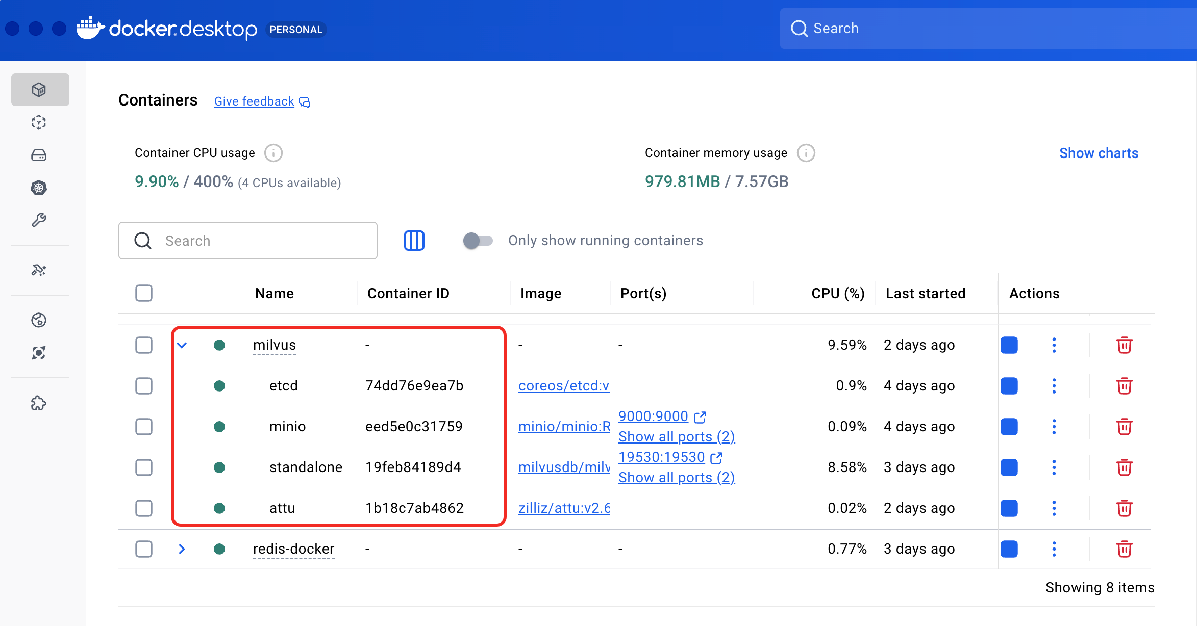 milvus-minio /usr/bin/docker-... minio Up (healthy) ...