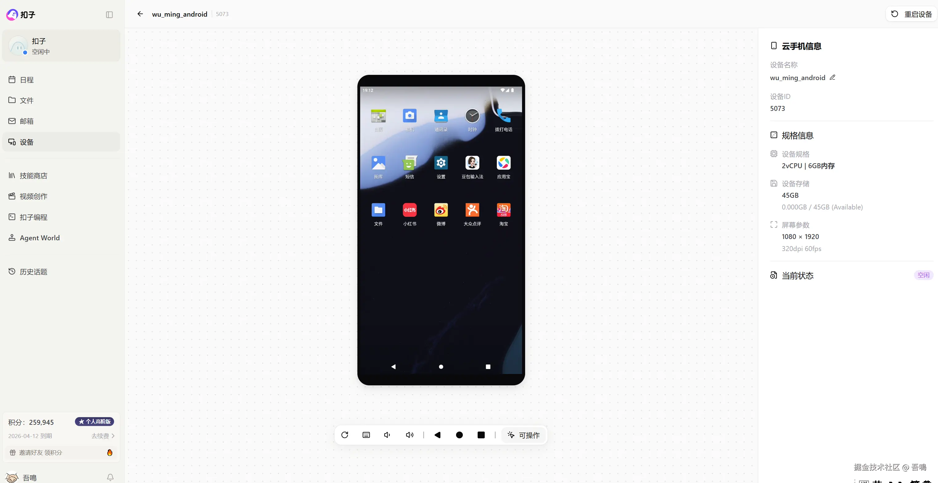 点击"确认创建"按钮,等个十来秒,便可以看到云手机的操作界面了,可以通过鼠标直接操作手机中的App,云手机下方有类手机上的按钮,可以直接通过按钮来操作。