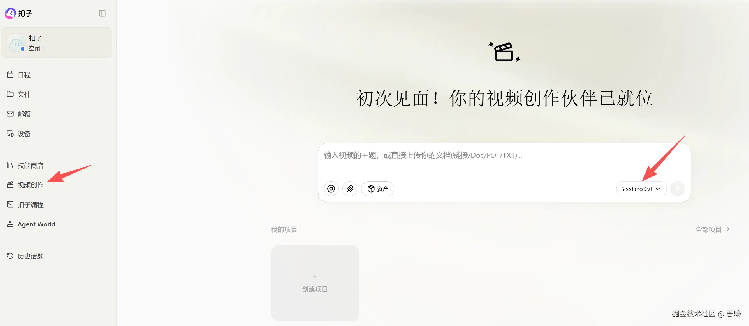 怎么样才能够使用上满血版的Seedance2.0?只需要在扣子左侧的菜单栏中,点击"视频创作"菜单,便可以进入到视频创作的页面。