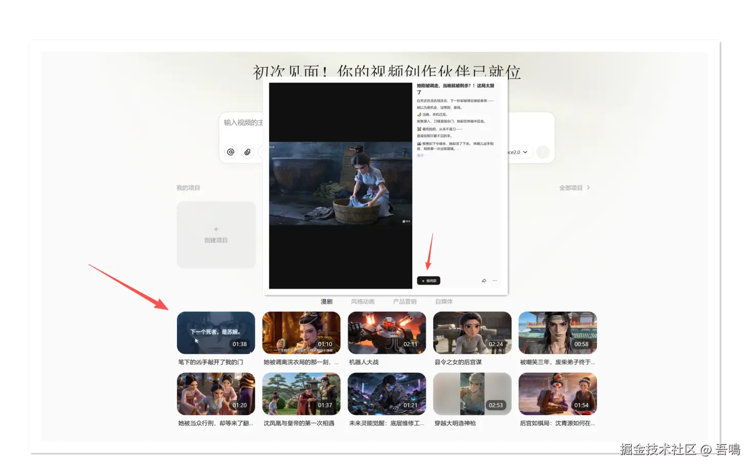 视频创作这部分还有一些做好的项目案例,点击查看详情,还能看到像某音类型的"做同款"功能。