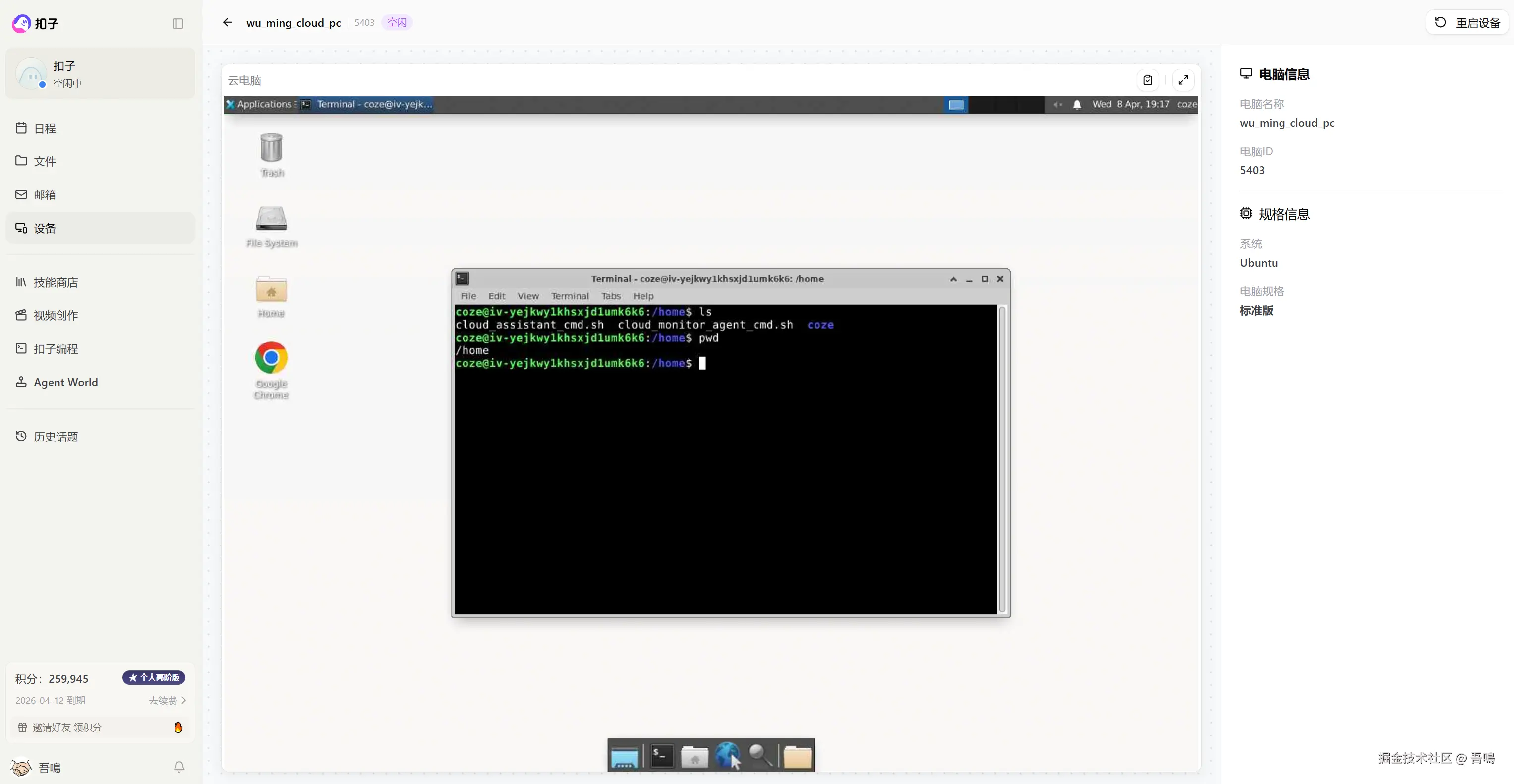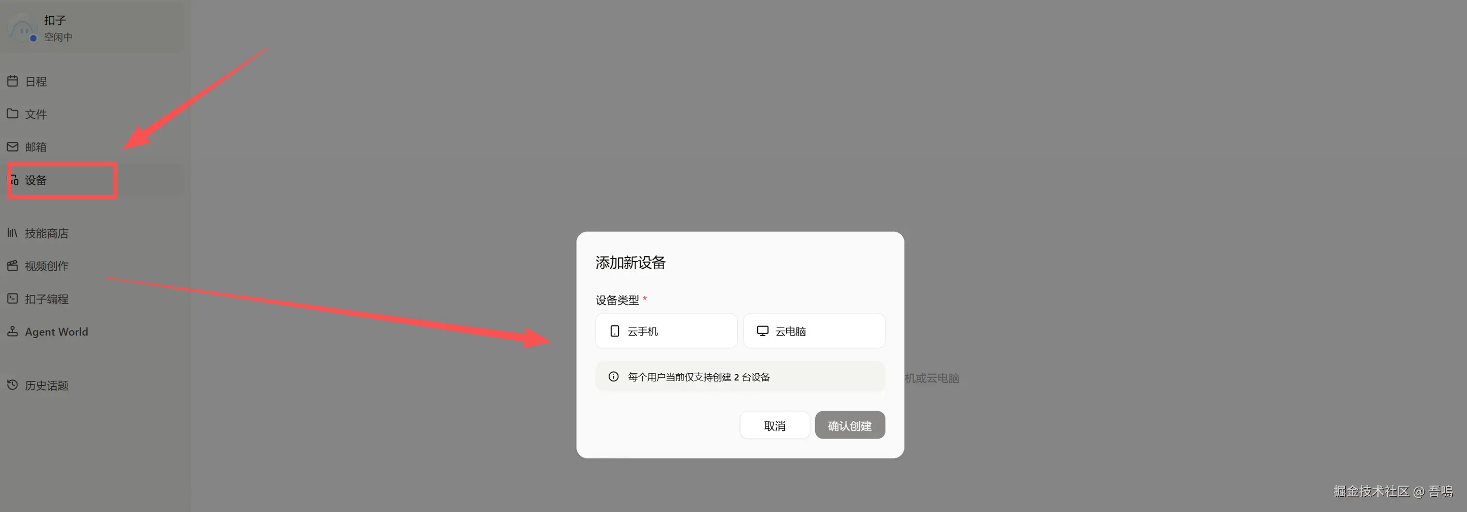 扣子2.5这次升级,直接支持在扣子上创建云电脑和云手机,只需要在左侧的菜单栏的"设备"菜单,然后选择创建云电脑和云手机即可,当前一人只能拥有两台设备。