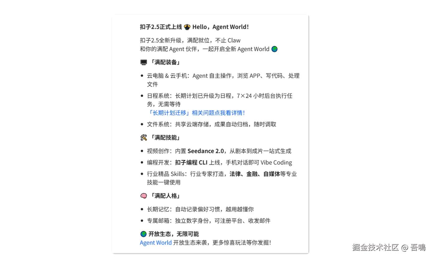 就在昨天扣子官方消息发布了2.5版本,这次的版本升级和2.0又有挺大的变化,无论是界面上还是功能上,都让人有点儿振奋。
