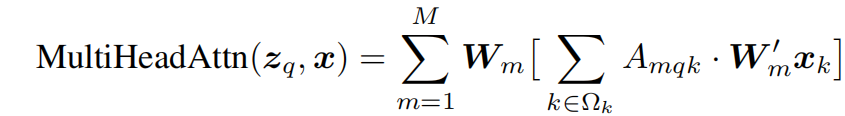 对于一个 query,我们只让它看:一个 reference point (参考点),这个点附近的 少量采样点 ,在这些采样点上取特征并加权求和