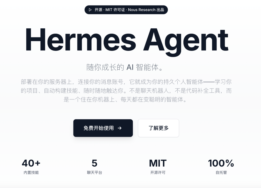 美国开源 AI 研究实验室 Nous Research 在推出过 Hermes-4-405B、Hermes-4-70B 等开源模型之后,推出了开源 Agent:Hermes Agent,是从"造模型"到"造 Agent"的延伸。