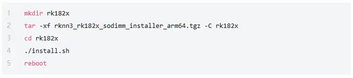 2. 驱动安装与验证将提供的适配套件 rknn3_rk182x_sodimm_installer_arm64.tgz 拷贝至开发板,并按顺序执行以下命令: