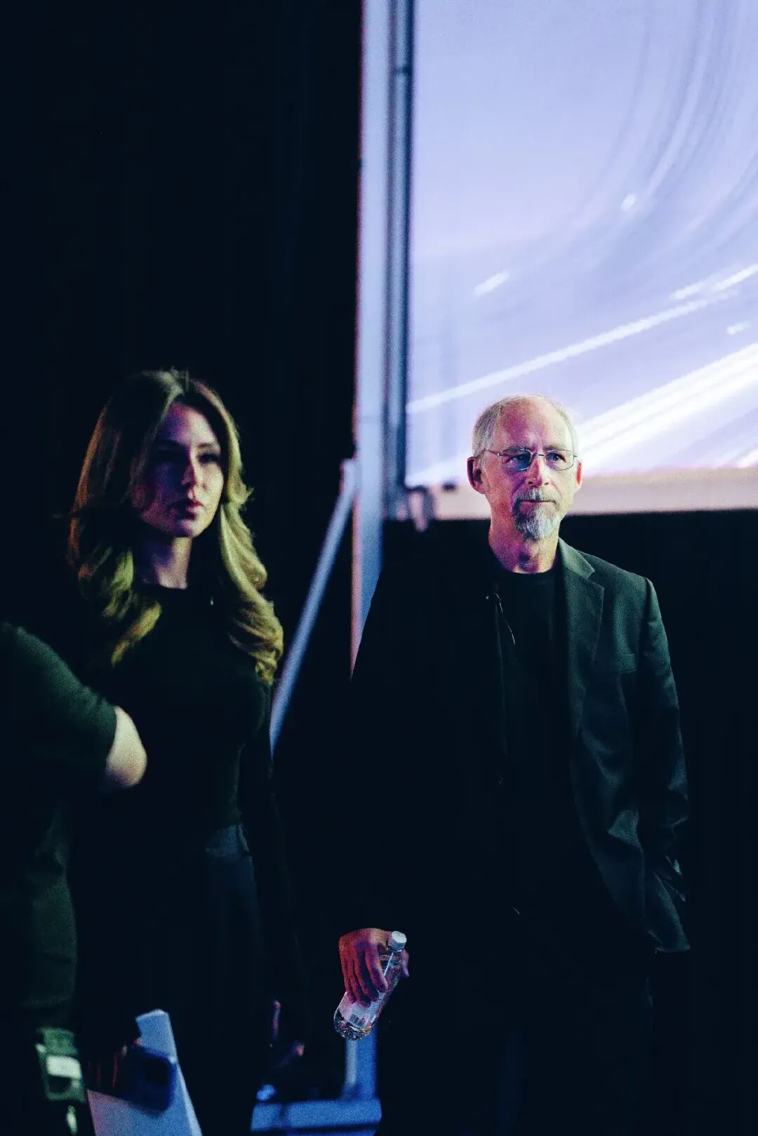 贝克先生站在光线昏暗的会议后台. 他右边有一位女士. 贝克先生2月在迈阿密会议的后台. 图片来源:阿米尔·汉贾为纽约时报拍摄