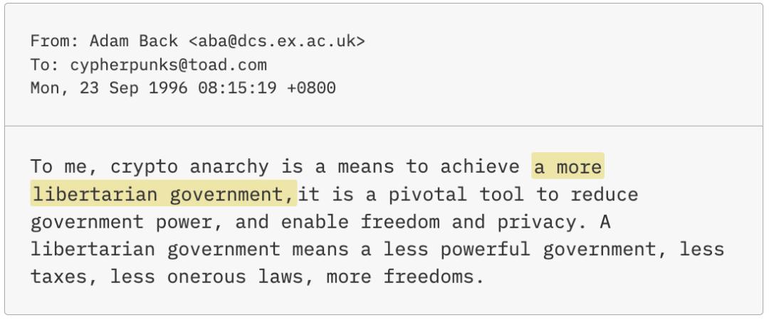 中本聪也很可能是「密码朋克」的成员, 这是一个成立于20世纪90年代初的无政府主义者团体, 他们希望利用密码学--即通过代码保护通信的艺术--将个人从政府的监视和审查中解放出来. 密码朋克主要通过一种叫做互联网邮件列表的东西进行交流. 作为今天留言板的前身, 邮件列表是订阅者在收件箱中收到的, 采用旧式打字机字体的群发电子邮件. 为了交流, 回复者会选择「回复所有人」.
