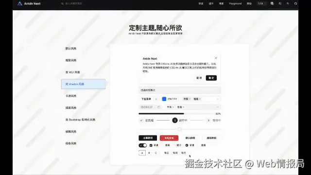 由于组件实现采用了 TSX,Antdv Next 的自定义主题相应地也采用了 CSS-in-JS,其主题是目前我个人比较喜欢的亮点之一。