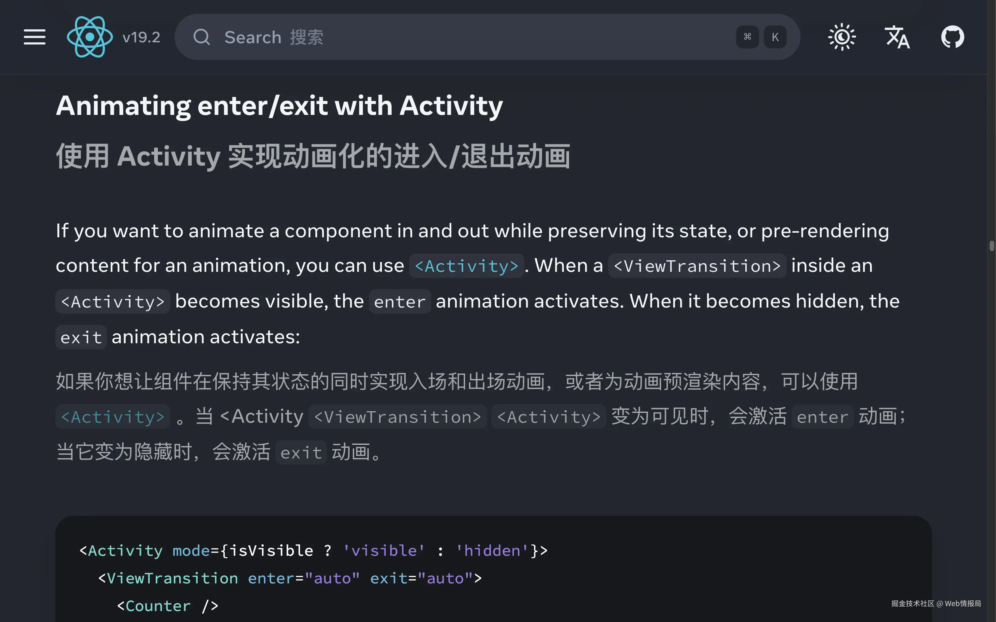 React 文档更新了 <ViewTransition /> 组件结合 <Activity /> 组件章节,如果你想让组件在保持状态的同时实现进场或出场动画,可以使用 <Activity /> 组件。